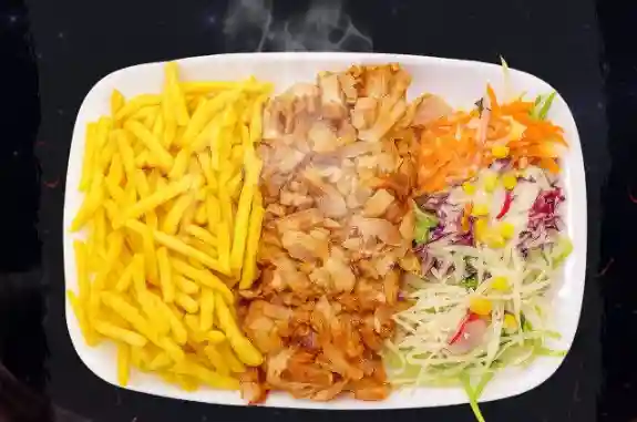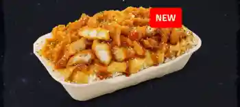 White rice, homemade white sauce, chicken tenders or cordon bleu, fried onions, parsley, Thai-style sauce