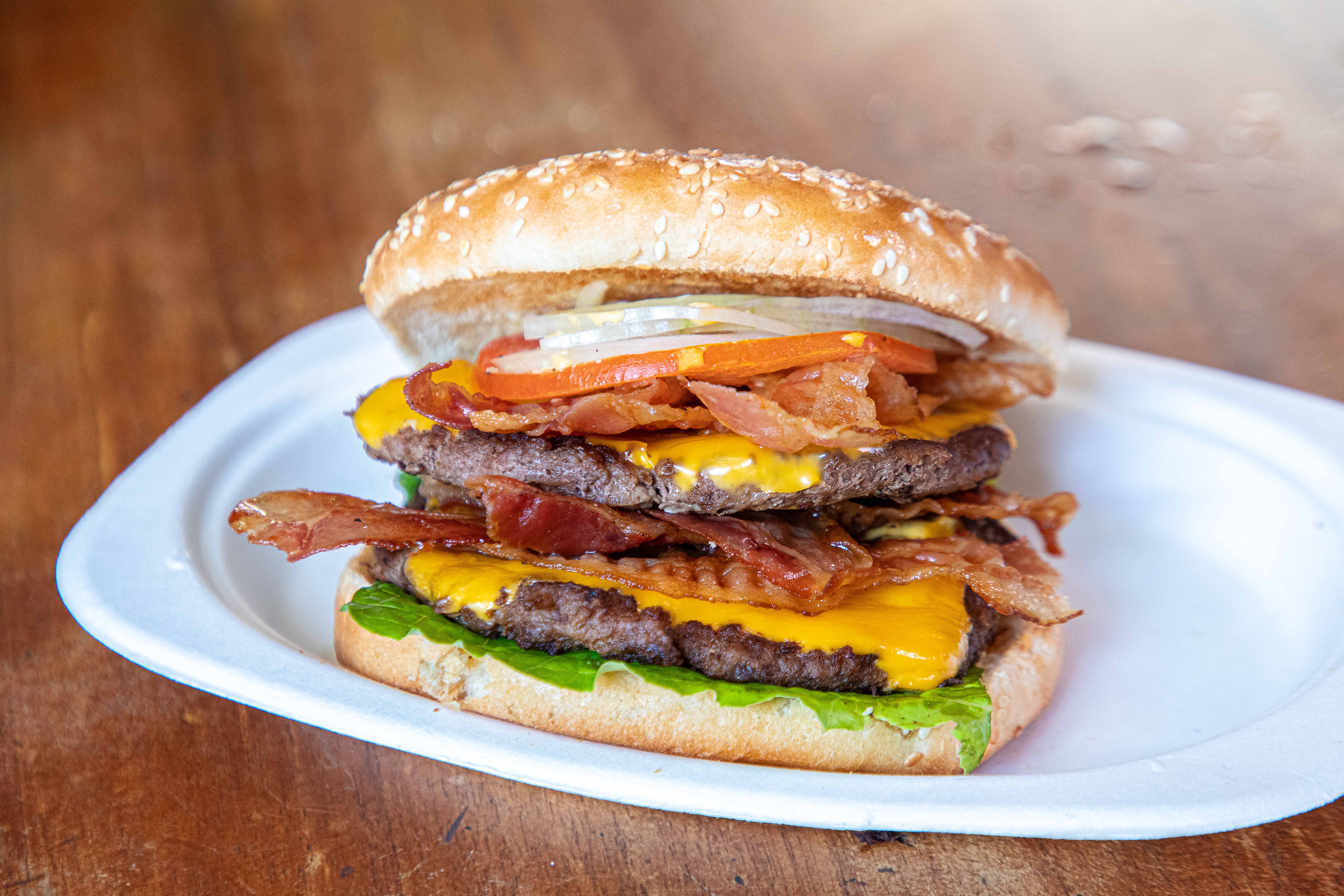 Triple Angus steaks, onions, tomato, lettuce, triple cheddar, triple bacon